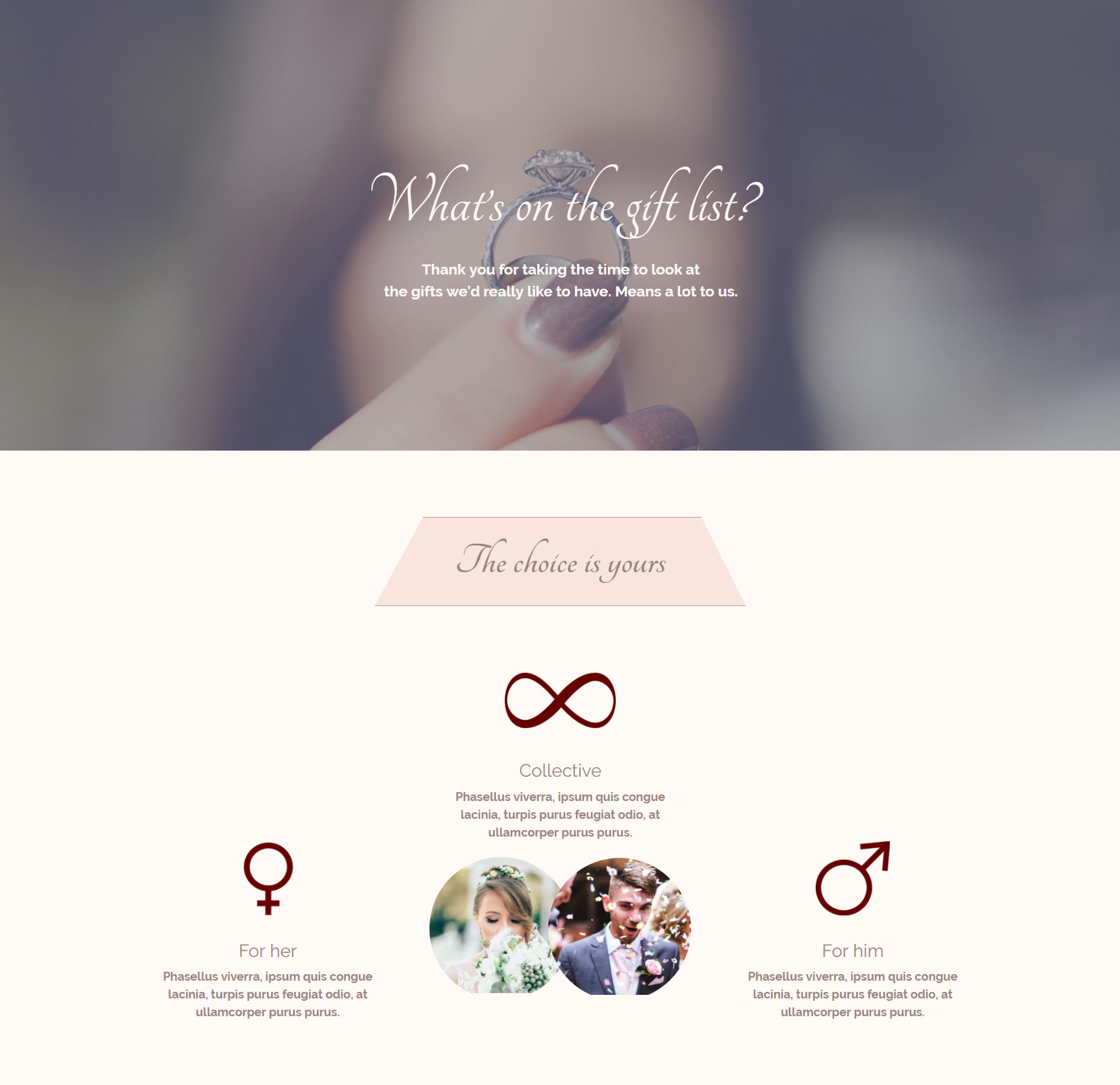 In diesem Layout möchten wir den Menschen die Wahl lassen. Sie können wählen, ob sie etwas für die Braut, den Bräutigam oder für beide kaufen möchten.