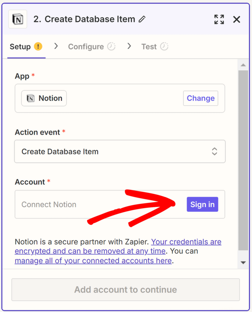 Ihr Aktionsereignis wurde bereits ausgewählt, Sie müssen Notion also nur noch mit Ihrem Zapier-Konto verbinden. Klicken Sie dazu auf die Schaltfläche „Anmelden“ neben „Konto“ .