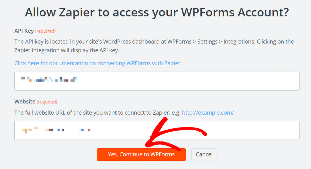 Kopieren Sie Ihren API-Schlüssel und fügen Sie ihn in das Zapier-Popup-Fenster ein. Geben Sie dann Ihren Domainnamen ein und klicken Sie auf die Schaltfläche „Ja, weiter zu WPForms“ .