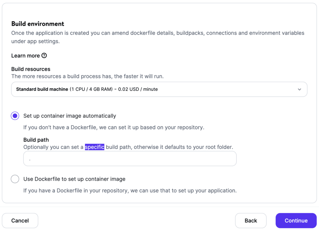 Sie können der Anwendung jetzt einen Namen geben, der nur im Dashboard verwendet wird, und aus 25 Rechenzentrumsstandorten auswählen, sodass Sie Ihre Anwendung an dem geografischen Standort platzieren können, der Ihren Benutzern am nächsten ist. Wenn Sie Hilfe bei der Bestimmung des idealen Rechenzentrums für Ihre Anwendung benötigen, sehen Sie sich unseren Leitfaden zur Auswahl des richtigen Rechenzentrumsstandorts an.