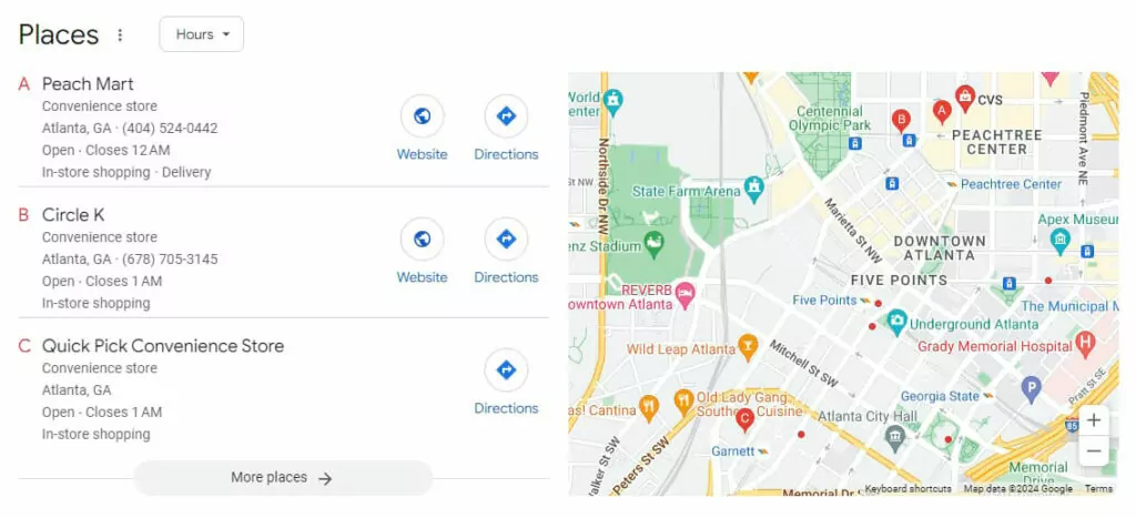 Wenn Sie nach einem Unternehmen suchen oder in Google Maps auf eine Adresse klicken, wird ein Fenster eingeblendet. Es enthält alle wichtigen Details wie die Telefonnummer des Unternehmens, Bewertungen und Öffnungszeiten. Sie können sogar sofort eine Wegbeschreibung von Ihrem aktuellen Standort aus abrufen oder deren Website mit einem Klick besuchen.