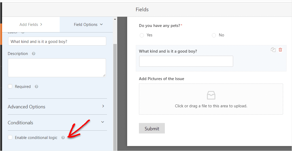 Beginnen Sie mit dem Ändern der Feldbezeichnung. In unserem Beispiel stellen wir die Frage „Was für eine Art und ist es ein guter Junge?“