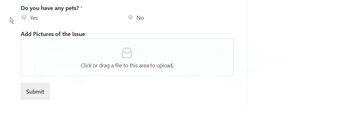 Immer wenn jemand Ihr WordPress-Formular ausfüllt, wählt er die Multiple-Choice-Option „Ja“, wenn er die Frage „Haben Sie Haustiere?“ beantwortet. Das einzeilige Textfeld wird angezeigt, damit sie weitere Details über ihren kleinen Freund eingeben können.