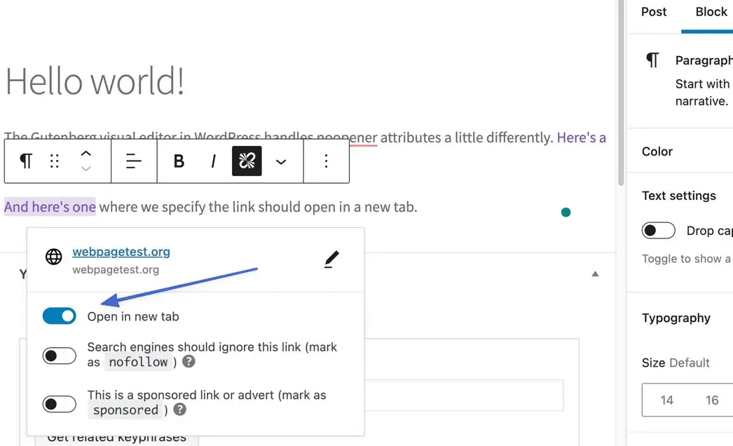 - WordPress fügt das Attribut automatisch ein, wenn ein Link erstellt wird, der sich in einem neuen Tab öffnet. Dies geschieht, wenn Sie den Gutenberg- oder traditionellen WordPress-Editor verwenden, wodurch im Wesentlichen jegliche manuelle Arbeit auf Ihrer Seite entfällt.