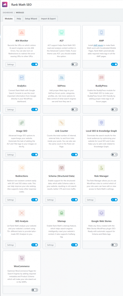 Rank Maths verfügt über eine optisch ansprechende Benutzeroberfläche und ein übersichtliches Dashboard. Sie können verschiedene Funktionen einfach einzeln ein- oder ausschalten. Jede der Funktionen wird in der Box zusammen mit ihrem aktiven Status beschrieben. So können Sie alle Funktionen ganz einfach nach Bedarf aktivieren/deaktivieren.