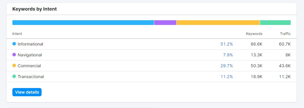 Dies ist nützlich, um Ihre SEO-Strategie zu überprüfen. Wenn Sie beispielsweise einen Blog betreiben, sollten Sie davon ausgehen, dass die meisten Ihrer Ranking-Keywords informativen Charakter haben. Wenn Sie jedoch einen Online-Shop betreiben, erwarten Sie, dass dieser transaktional oder kommerziell ist.