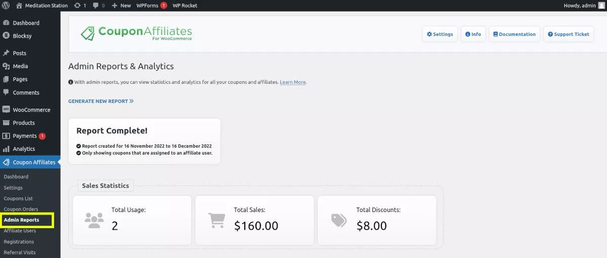 Coupon Affiliates bietet detaillierte Verkaufs- und Provisionsberichte, die Sie über das Menü Admin-Berichte erstellen können.