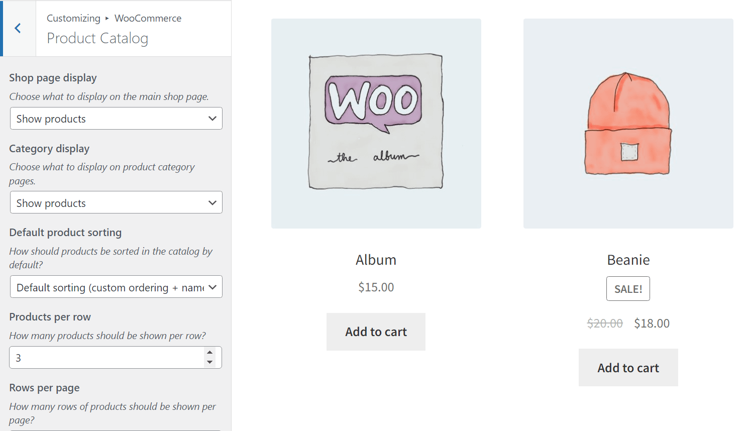 Mit dem Customizer können Sie das Shop-Layout ändern, entscheiden, wie viele Spalten und Produkte angezeigt werden sollen, welche Elemente enthalten sein sollen, und sogar unendliches Scrollen ermöglichen: