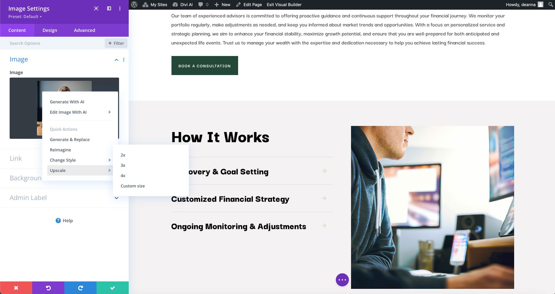 Divi Image AI lässt sich mühelos in jedes Divi-Modul integrieren, das Bilder anzeigt, sei es auf einer Seite oder in einem Beitrag. Mit integrierten Schnellaktionen für Stilanpassungen, Bildskalierung und andere Verbesserungen können Sie Ihre Bilder ganz einfach verfeinern.