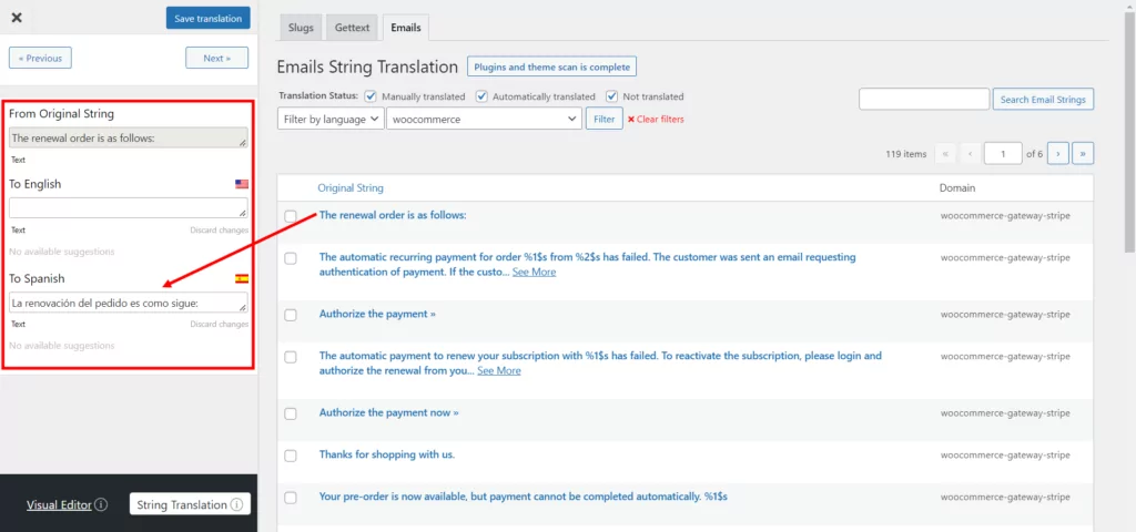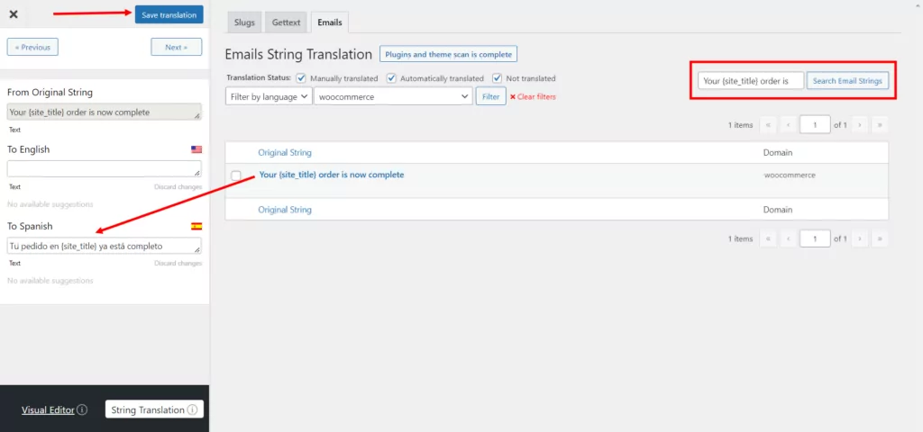 Mit dem String-Übersetzungseditor können Sie Übersetzungen für die standardmäßigen WooCommerce-E-Mails und auch für die benutzerdefinierten einfach bearbeiten. Dies hilft Ihnen dabei, allen Ihren Kunden gerecht zu werden und ihnen die Informationen, die sie benötigen, in einer Sprache bereitzustellen, die sie verstehen.