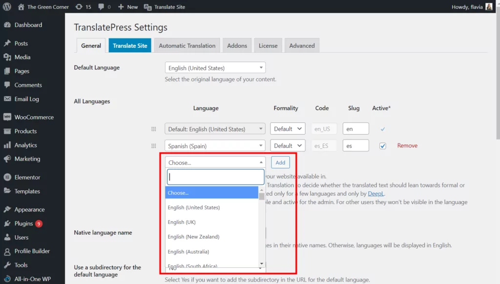 Gehen Sie als Nächstes zu Einstellungen → TranslatePress , um Ihre Sprachen hinzuzufügen. Wählen Sie Ihre Standardsprache und fügen Sie dann Ihre sekundäre(n) Sprache(n) aus der Dropdown-Liste hinzu.