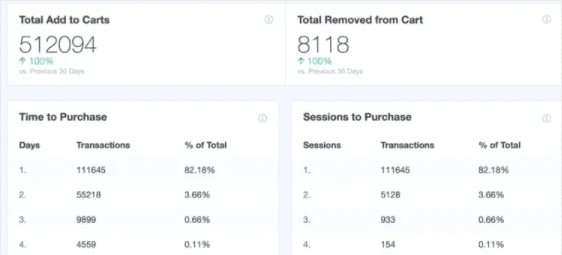 Wenn Sie an diesen ersten Berichten zu Conversion-Raten, Transaktionen, Umsatz, durchschnittlichem Bestellwert und Top-Produkten vorbeiscrollen, finden Sie weitere wichtige Details zum Verhalten Ihrer Käufer.