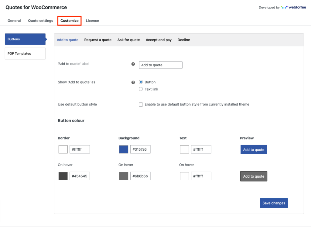 Von hier aus können Sie verschiedene Schaltflächen im Zusammenhang mit der Option „Angebot anfordern“ von WooCommerce anpassen.