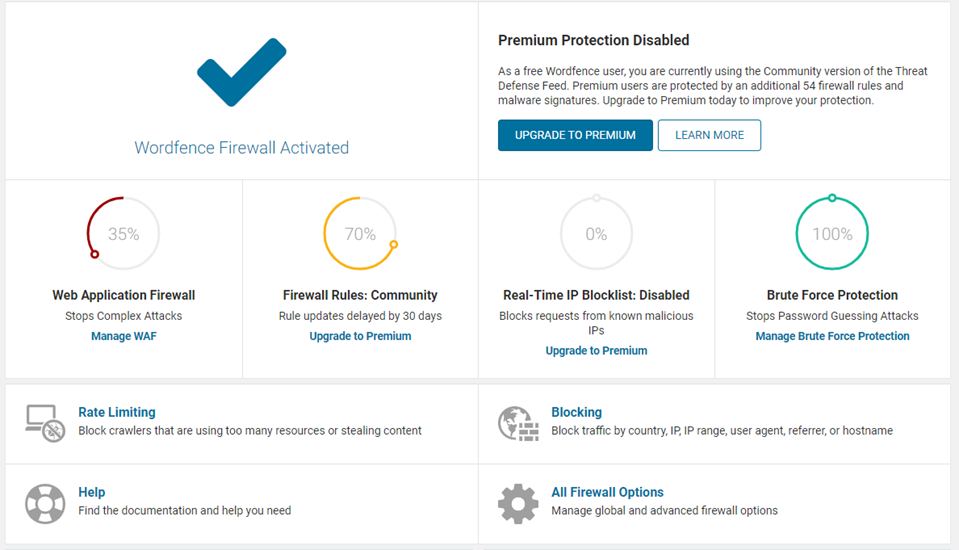 Die kostenlose Version von Wordfence bietet den Nutzern einiges . Ein kostenloser Benutzer zu sein hat seine Nachteile. Sie erhalten keine Echtzeit-Firewall-Updates, IP-Blacklists oder Malware-Signaturen. Wenn vom Wordfence-Team Sicherheitsprobleme entdeckt werden, werden diese sofort für Premium-Benutzer gepatcht. Kostenlose Benutzer erhalten diese Fixes jedoch 30 Tage später.