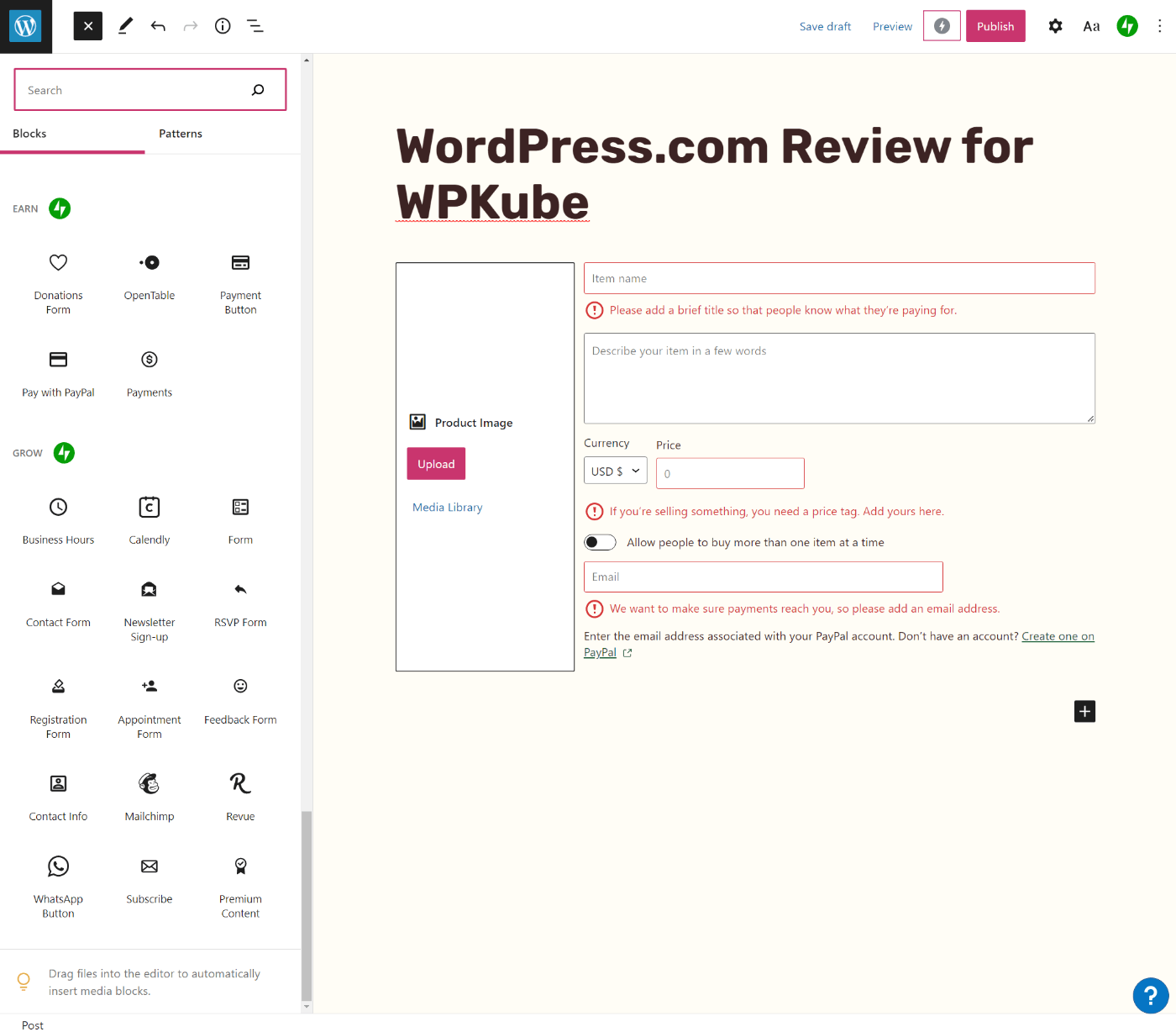 WordPress.com fügt jedoch einige nützliche Tools hinzu, wie z. B. eine Reihe von benutzerdefinierten Blöcken. Dazu gehören Schaltflächen, um Zahlungen mit PayPal oder Stripe zu akzeptieren, Formulare zu erstellen und so weiter.
