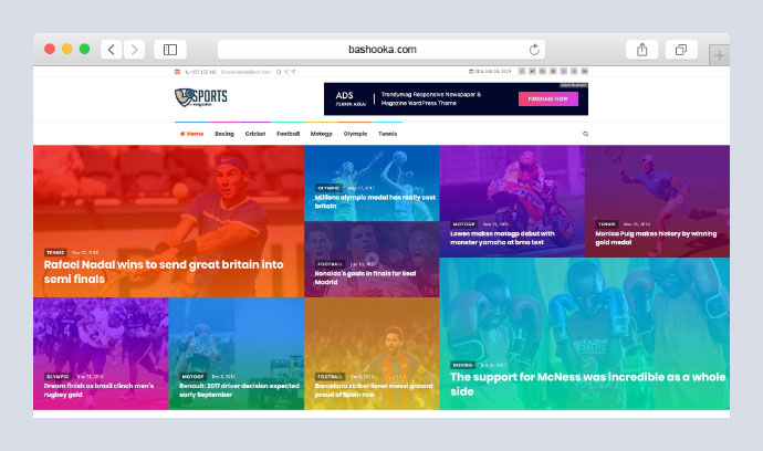 Viene con un diseño fresco y una combinación de colores y tipografía agradables, especialmente adecuado para revistas deportivas y otros sitios web editoriales relacionados con deportes, como portales de noticias para clubes deportivos u otros.