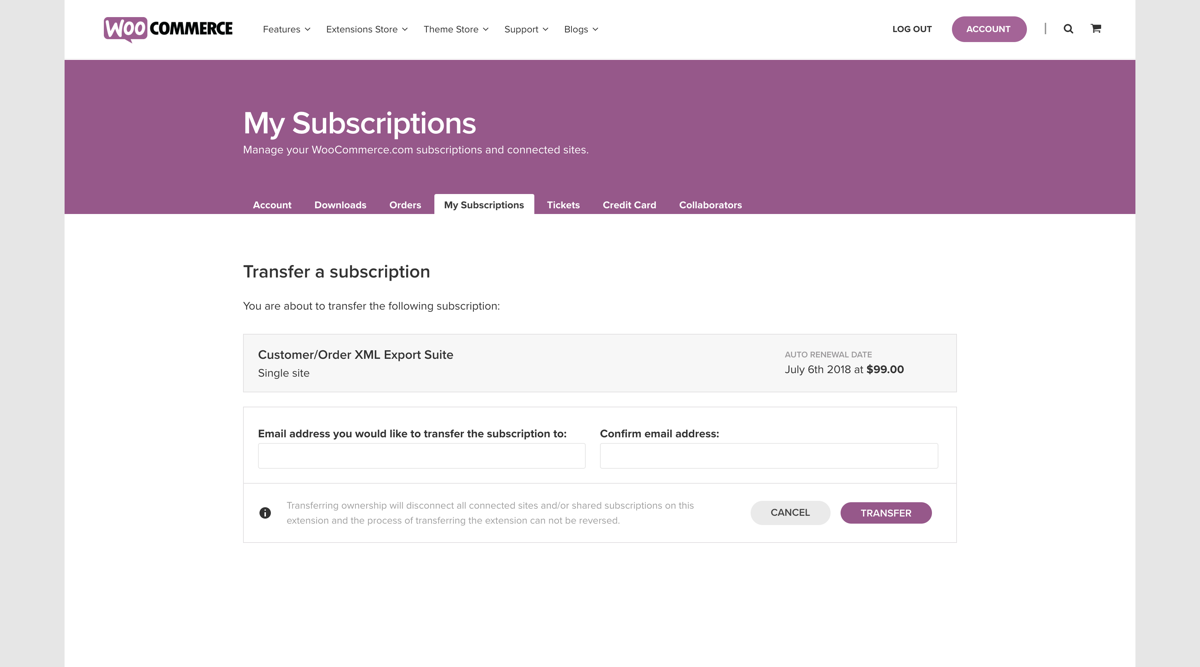 También ofrecemos la opción de transferir suscripciones de WooCommerce.com. Esto significa que lo contrario también es posible: puede comprar extensiones de WooCommerce para sus clientes y luego transferirles esa misma suscripción. De esta manera, obtiene la facilidad de ser el propietario durante el proceso de desarrollo, mientras que el cliente tiene el beneficio de la propiedad después de esa etapa.