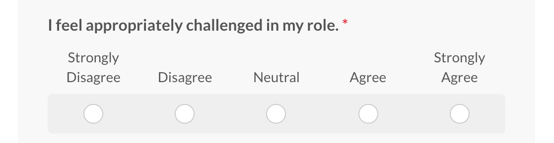 La plantilla tiene el formato de una escala de Likert, lo que significa que las preguntas se presentan como declaraciones. Luego, los empleados seleccionarán su respuesta según el grado en que estén de acuerdo con la declaración.