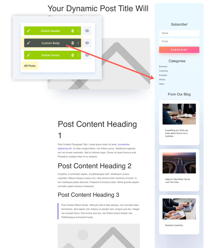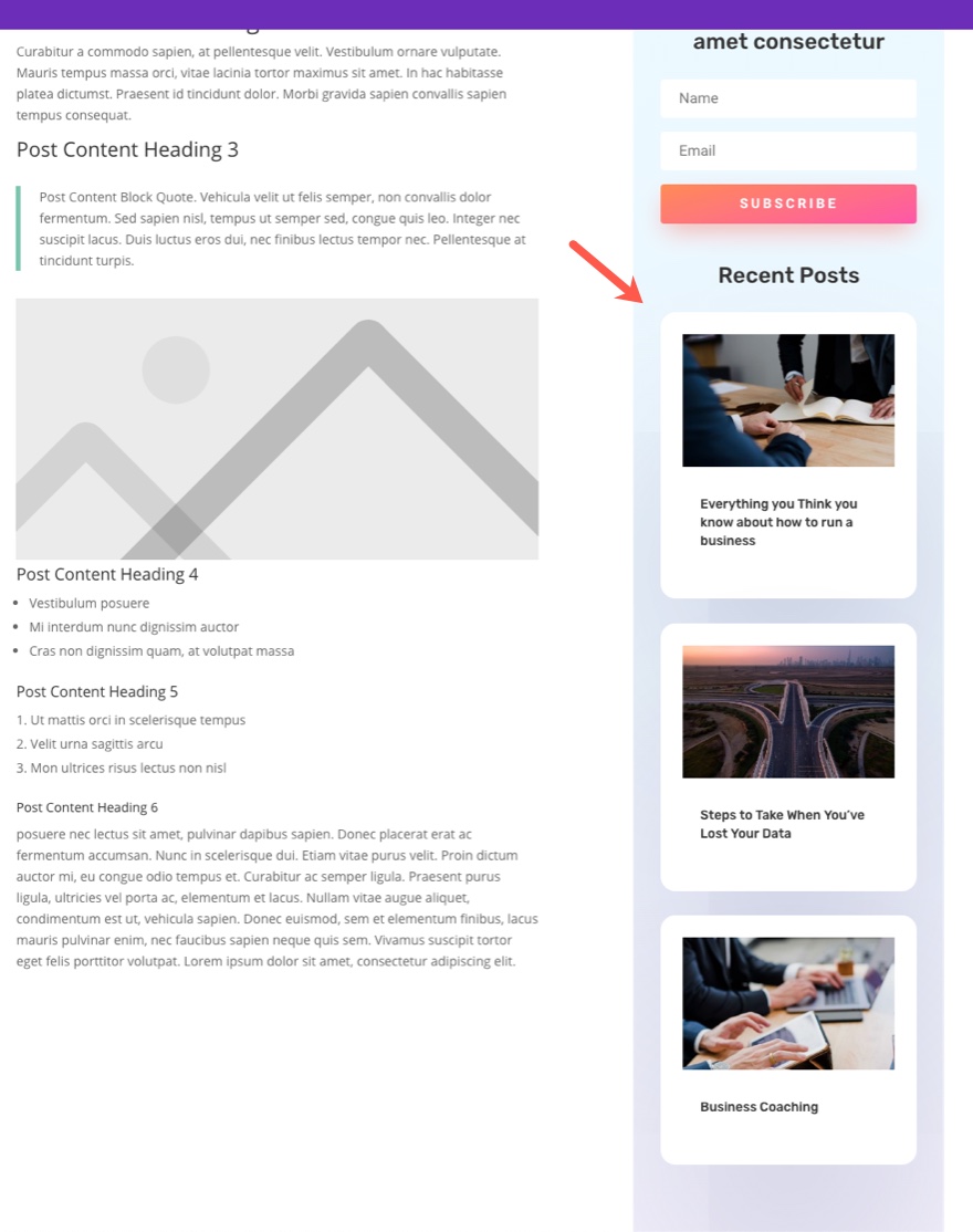 Dado que el contenido de la barra lateral se agrega a una plantilla, querrá aprovechar el contenido dinámico. Por ejemplo, para una plantilla de publicación, es posible que desee incluir un módulo de blog con publicaciones recientes en su barra lateral.