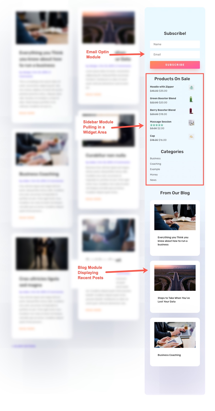 También puede combinar áreas de widgets (con todos sus widgets) con módulos Divi para un diseño más personalizado para el contenido de su barra lateral. Esto le dará la libertad de utilizar cualquiera de los widgets de WordPress integrados que le encantan además de los módulos Divi.
