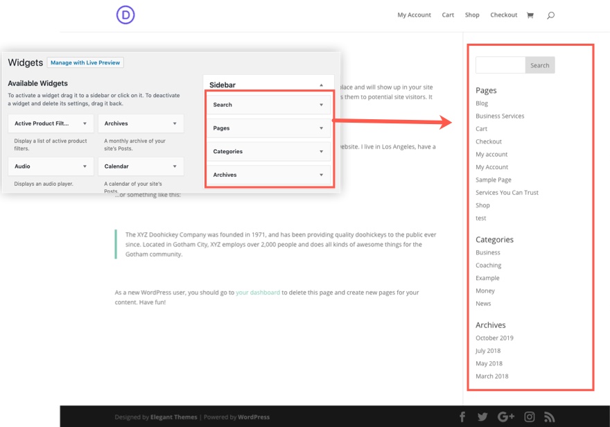 Las barras laterales de WordPress son las integradas en la plantilla predeterminada de un tema Divi. Estas barras laterales se mostrarán para páginas o publicaciones que tengan un diseño que incluya una barra lateral y no utilicen Divi Builder para diseñar la página.