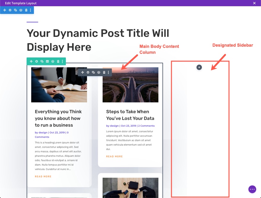 Al editar el área del cuerpo personalizada de su plantilla con el editor de diseño de la plantilla, puede agregar el módulo de la barra lateral a la columna de la barra lateral designada.