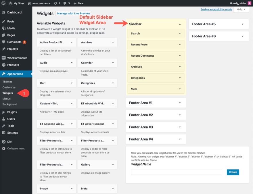 WordPress (y Divi) usan las áreas de widgets para llenar la barra lateral de forma predeterminada. Las áreas de widgets se pueden encontrar yendo al Tablero de WordPress y navegando a Apariencia> Widgets. Allí verá el área de widgets de la barra lateral predeterminada que ya está llena de widgets.