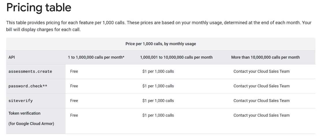 reCAPTCHA es de uso gratuito con hasta 1 millón de llamadas por mes. Más allá de este punto, deberá actualizar a reCAPTCHA Enterprise a un costo de $ 1 por llamada API hasta 10 millones de llamadas API. Si necesita más llamadas a la API, deberá comunicarse con su equipo de ventas de Google Cloud para obtener precios personalizados.