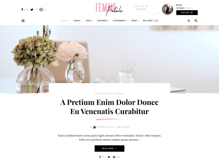 El tema de Florencia es una opción receptiva con varios elementos femeninos. Este tema de blog elegante y con clase tiene una variedad de formatos de publicación y toneladas de opciones de personalización. El diseño de blog clásico es ideal para enfocarse en su contenido, y los formatos de publicación incluyen publicaciones estándar, de video, de galería y de música. Florence ofrece un feed de Instagram de ancho completo en el área del pie de página, que agrega un componente visual a su sitio y empuja a las personas a sus feeds sociales.