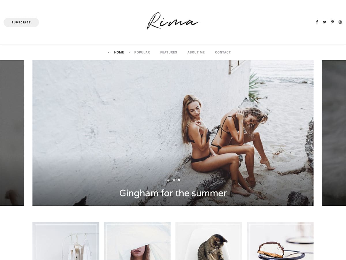 Considere el tema Rima si está buscando un tema elegante hecho para blogueros. El tema le permite elegir entre varios diseños de página de inicio, como una versión deslizante que es perfecta si desea mostrar sus publicaciones más recientes o una versión estándar que enumera las publicaciones de su blog. El tema también le permite agregar varias fuentes de redes sociales a su barra lateral para que pueda crear seguidores fácilmente.