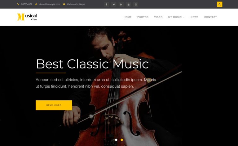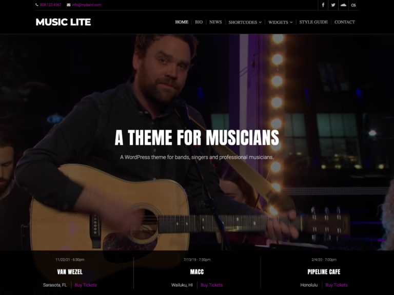 El tema Musical Vibe es receptivo, por lo que se verá genial en cualquier dispositivo. También está listo para la traducción, de modo que puede hablar y comunicarse con cualquier persona, en cualquier parte del mundo. Admite una barra en la parte superior de la página de inicio que puede usar para mostrar su información de contacto y cuentas de redes sociales. Además, incluye plantillas de página y secciones para fotos, videos, audio, un formulario de contacto y un blog.