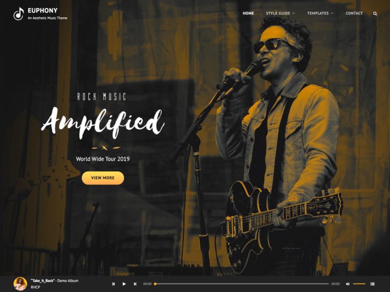 Este tema brinda muchas oportunidades para mostrar imágenes y gráficos de alta resolución para atraer a los visitantes. También es personalizable, por lo que puede ajustar los colores, el diseño y la apariencia general para satisfacer sus necesidades específicas y satisfacer las expectativas de sus visitantes. Si no está seguro de lo que esperan los visitantes, siempre puede visitar los sitios de otros músicos para ver qué tienen y cómo presentan su contenido para inspirarse.