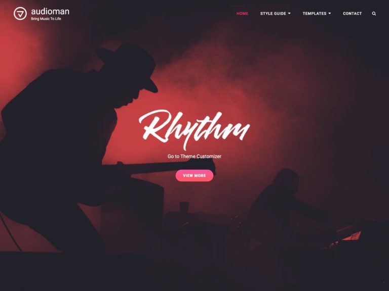 Otro gran tema gratuito de música de WordPress que vale la pena considerar se llama Audioman. Este tiene un estilo un poco más moderno que apunta sólidamente a la interpretación de músicos y bandas. Su enfoque principal es la promoción de eventos musicales, y cuenta con el conjunto de funciones adecuado para que esto sea posible y fácil. Incluye una variedad de módulos fáciles de usar que puede configurar para crear un sitio único y atractivo.