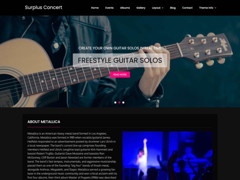 Surplus Concert es receptivo y está listo para traducir, además las llamadas a la acción destacadas en el control deslizante de la página de inicio seguramente alentarán un clic. Esta es otra gran selección para músicos y artistas de gira.