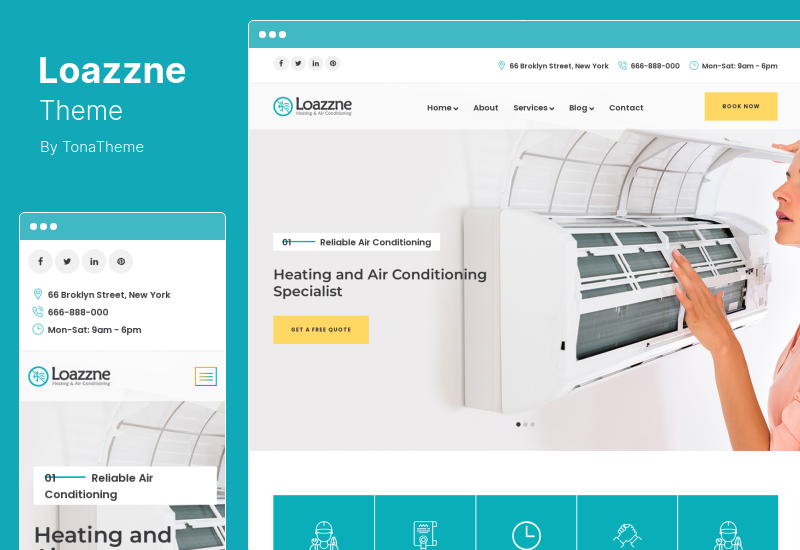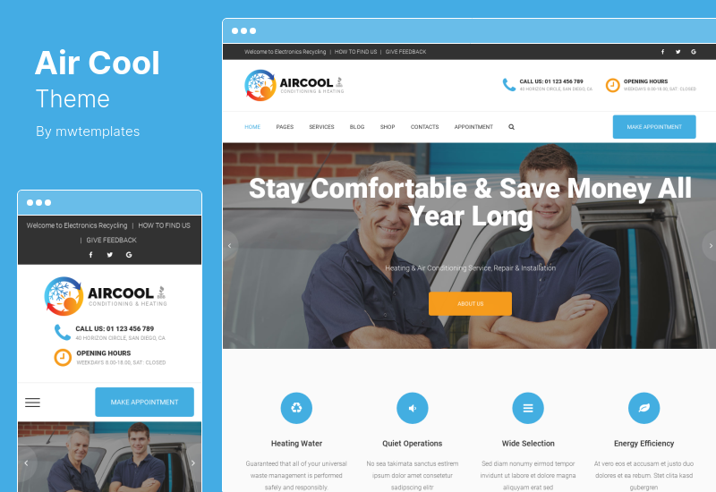 Además, este tema de HVAC se puede utilizar para publicitar servicios de mantenimiento del hogar, aire acondicionado y calefacción, y ventilación, así como para servir como una tienda en línea que vende acondicionadores de aire y suministros.