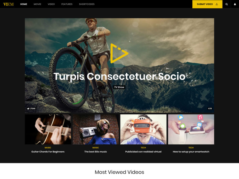Con ocho demostraciones de sitios web de alta calidad en el paquete de Viem, es posible que le resulte difícil tomar una decisión sobre cuál usar. La opción principal es un fuerte competidor para la mejor demostración, gracias a su diseño interesante y el diseño de la página de inicio rica en funciones. El reproductor de video grande en la parte superior de la página de inicio le brinda una buena oportunidad para mostrar un video que no desea que sus visitantes se pierdan como el punto focal principal de su sitio web.