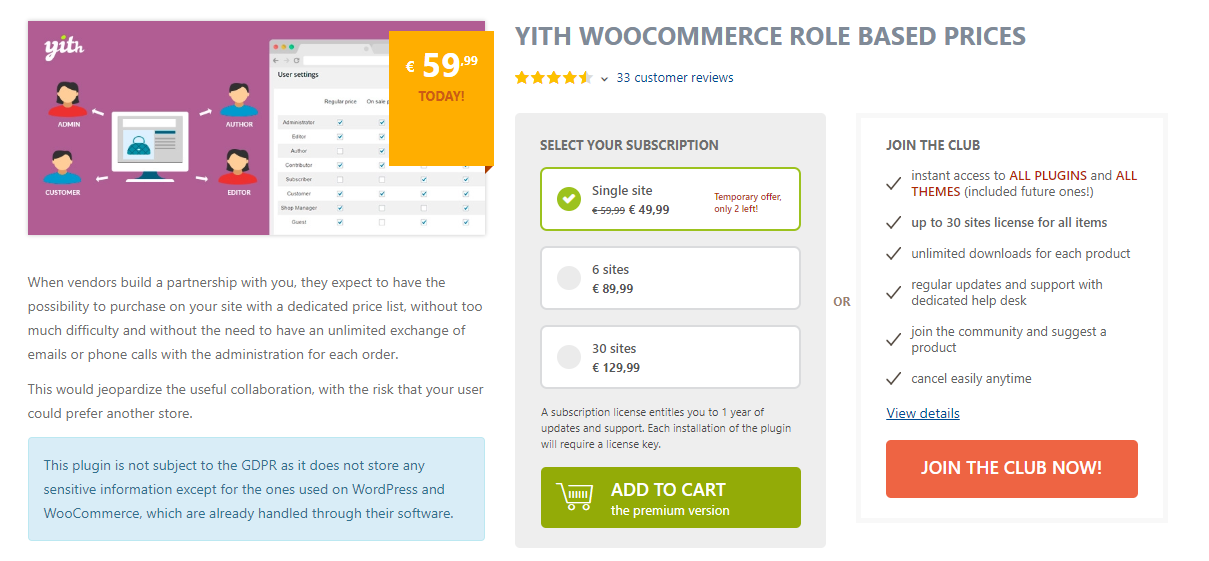 Además, el complemento lo ayuda a modificar la visibilidad de sus productos para permitir ventas mayoristas o basadas en membresía. Encontrará 4 ofertas de licencia para comprar este producto, comenzando con una licencia de sitio único de $50.