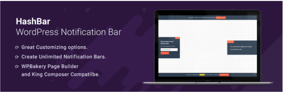 Con HashBar, puede crear toneladas de diferentes barras de notificación y formularios emergentes. Las opciones de personalización le permiten agregar texto, cambiar el color, los diseños y cambiar la posición de las barras de notificación en su sitio.