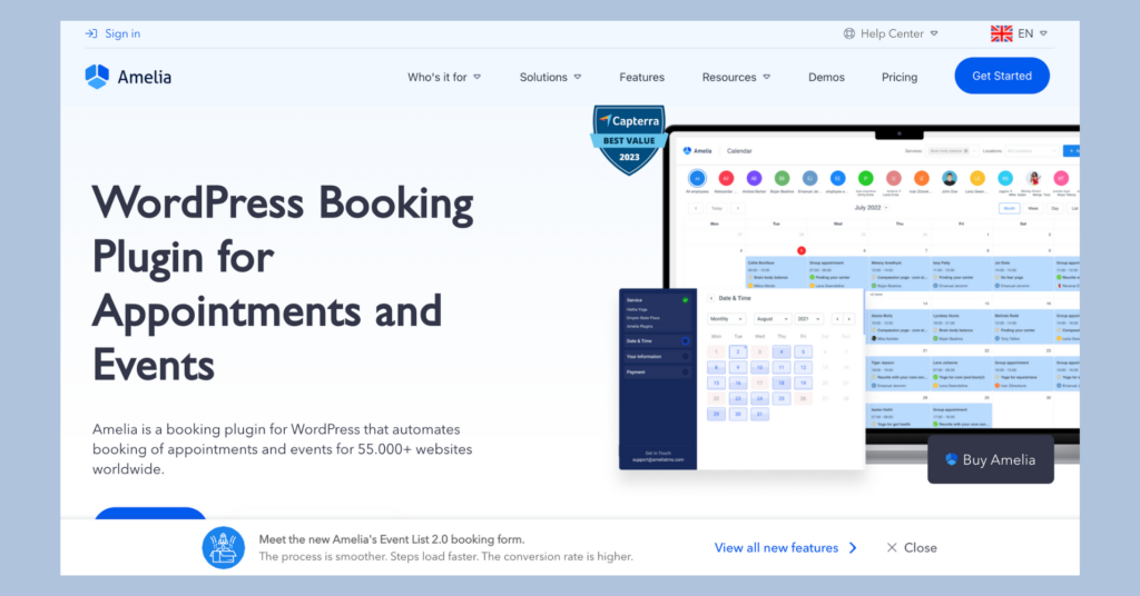 Amelia es un complemento de reserva de WordPress versátil y fácil de usar que automatiza los procesos de programación de citas y reserva de eventos en línea. Está diseñado para simplificar y agilizar el proceso de gestión de citas, reservas y reservas para empresas de todos los tamaños.