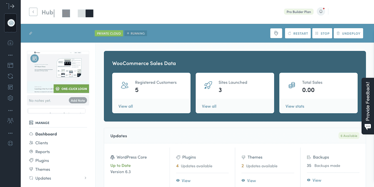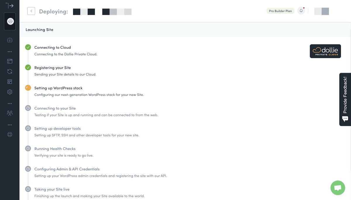 En nuestra opinión, uno de los puntos clave de venta de Dollie es la rapidez con la que se lanza un sitio. Esto es gracias a la herramienta Nube Privada. Oculta casi todas las consideraciones técnicas en tres clics. Aquí es donde se alojan los sitios web de sus clientes. Su WaaS tiene marca blanca completa. Estas son las características principales: