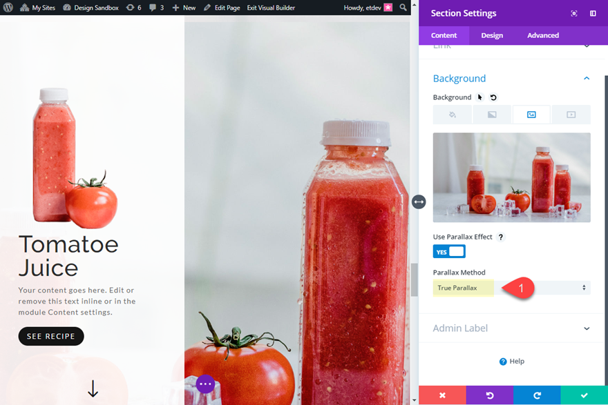 Abra una de las configuraciones de la sección y cambie el método CSS a "True Parallax".