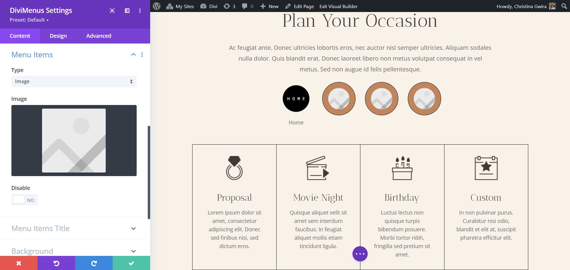 El submódulo agrega los elementos al menú. He agregado tres elementos de menú en el siguiente ejemplo. Dale a cada uno un título, elige un ícono, ajusta cómo funcionan y dales estilo individualmente desde la configuración del submódulo. En la parte delantera, estos elementos de menú se muestran cuando el usuario hace clic en el icono de la hamburguesa. Además, tiene la opción de mostrar el DiviMenu ya abierto cuando se carga la página e incluso ocultar el botón de menú.