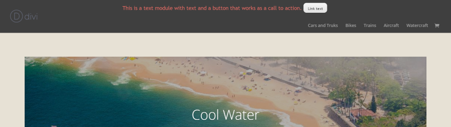 Creé un diseño con un módulo de texto y ajusté el tamaño de fuente, los colores y el relleno. Coloca el texto sobre el menú usando el mismo fondo que el encabezado, a menos que le asigne un estilo personalizado. Este incluye un botón que puede llevar al lector a una página, publicación, producto, etc. Esta es una excelente manera de crear una llamada a la acción sobre el encabezado.