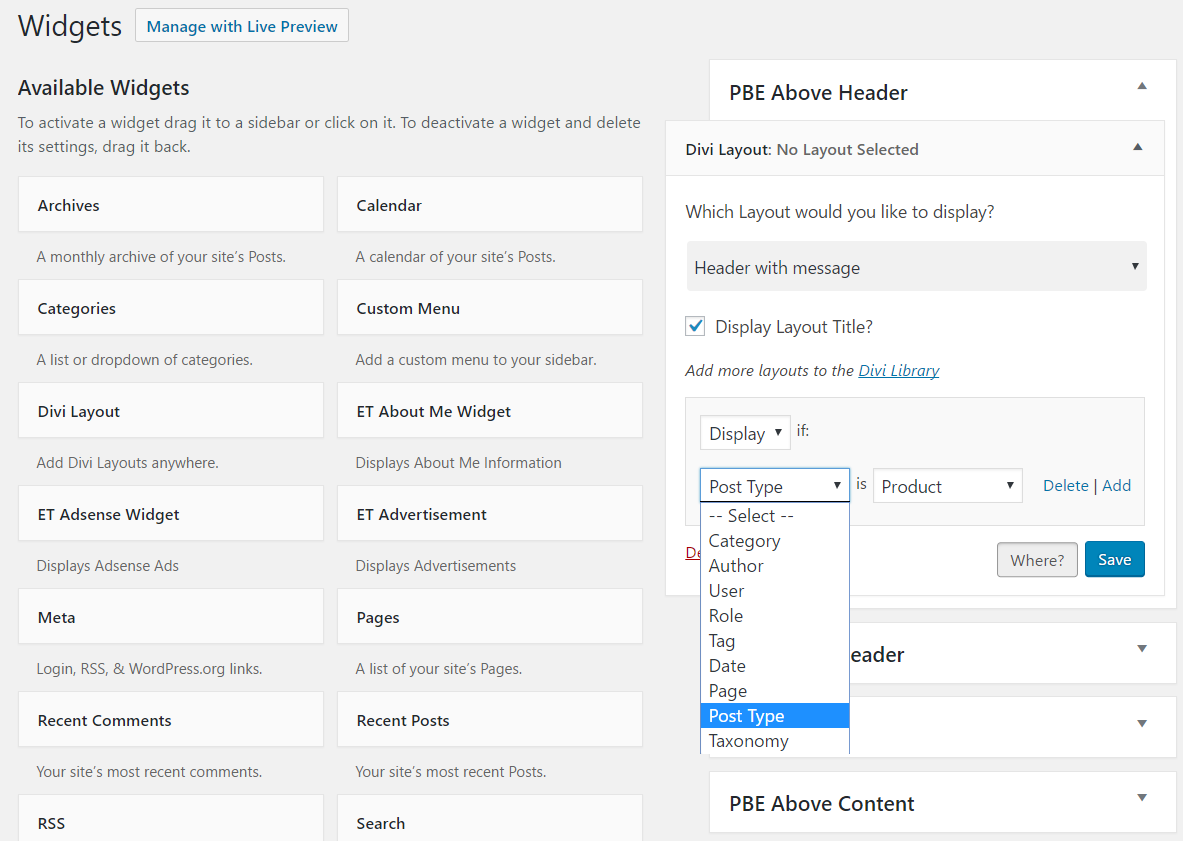 El widget te permite usar lógica condicional para que puedas decidir cuándo aparece el diseño. Seleccioné Encabezado con mensaje e hice clic en Dónde . Esto abre la lógica condicional para que pueda elegir si mostrar o no, seleccionar el tipo de publicación y elegir el resultado de los cuadros desplegables. Puede agregar tantas condiciones como desee. Usan lógica OR, por lo que mostrará SI Esto = Eso O esto = Eso O ...