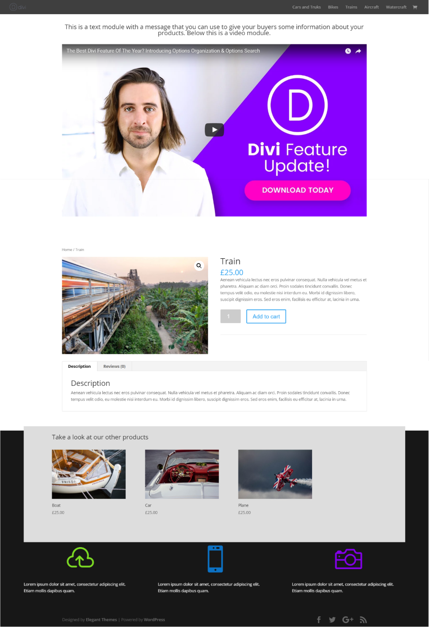 El resultado es una página de producto con diseños Divi por encima y por debajo del producto.