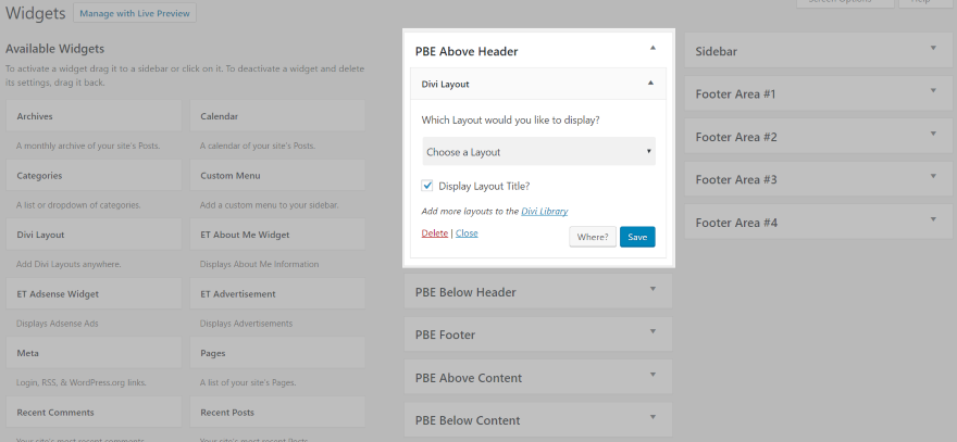 El complemento agrega cinco nuevas áreas de widgets a Divi y le permite colocar sus diseños en esas ubicaciones: