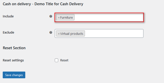 Esto funciona excelentemente bien si desea deshabilitar ciertas pasarelas de pago para productos con diferentes márgenes de beneficio o costos. Así, por ejemplo, si queremos deshabilitar el pago contra reembolso para productos virtuales específicos, simplemente podemos escribir el nombre de la categoría del producto en el campo Excluir para Pago contra reembolso. Una vez que haya terminado, haga clic en Guardar cambios.
