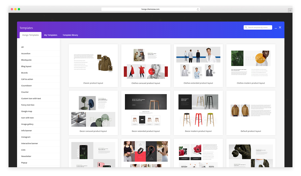 Después de realizar las pruebas para esta revisión de Hongo, es justo decir que si elige este tema, tendrá acceso a un gran conjunto de plantillas para su tienda en línea, así como a algunas funciones de comercio electrónico realmente útiles.