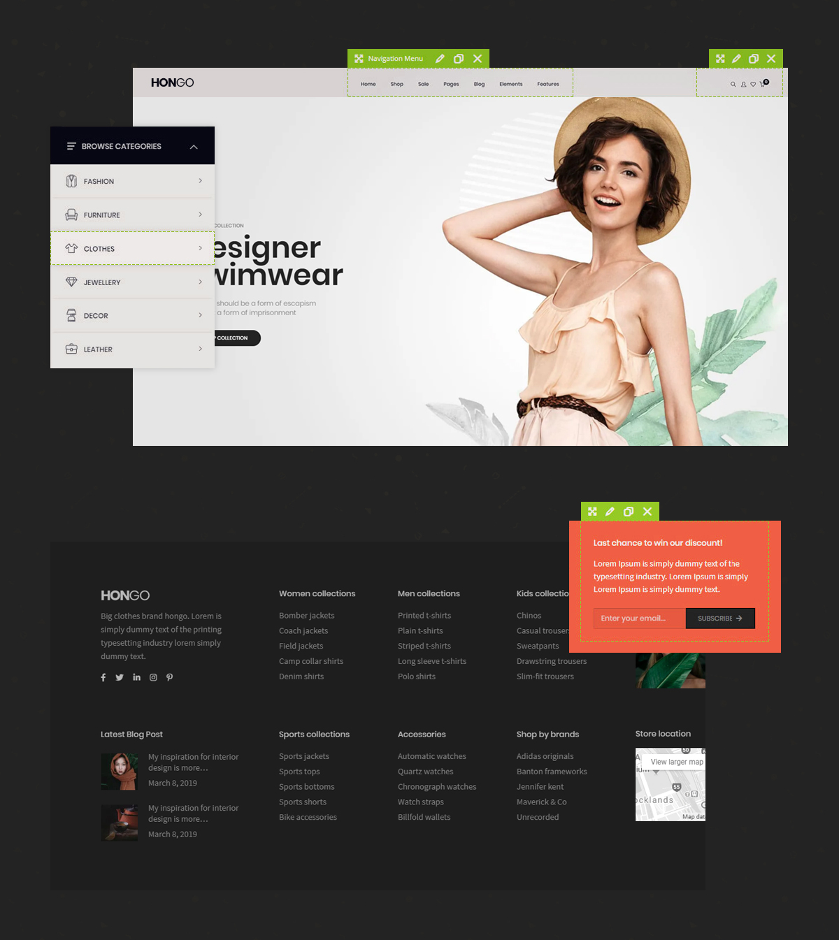 Si bien el contenido prediseñado de Hongo se ve muy bien, todo se puede personalizar fácilmente. Gracias a la inclusión de un complemento de creación de páginas premium y un poderoso conjunto de opciones de personalización de temas, obtiene un control creativo total sobre el aspecto de su tienda de comercio electrónico.