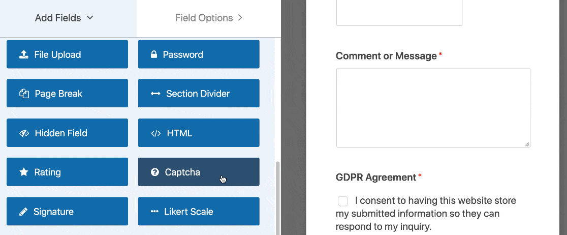 Mire los campos estándar a la izquierda y haga clic en el campo reCAPTCHA.